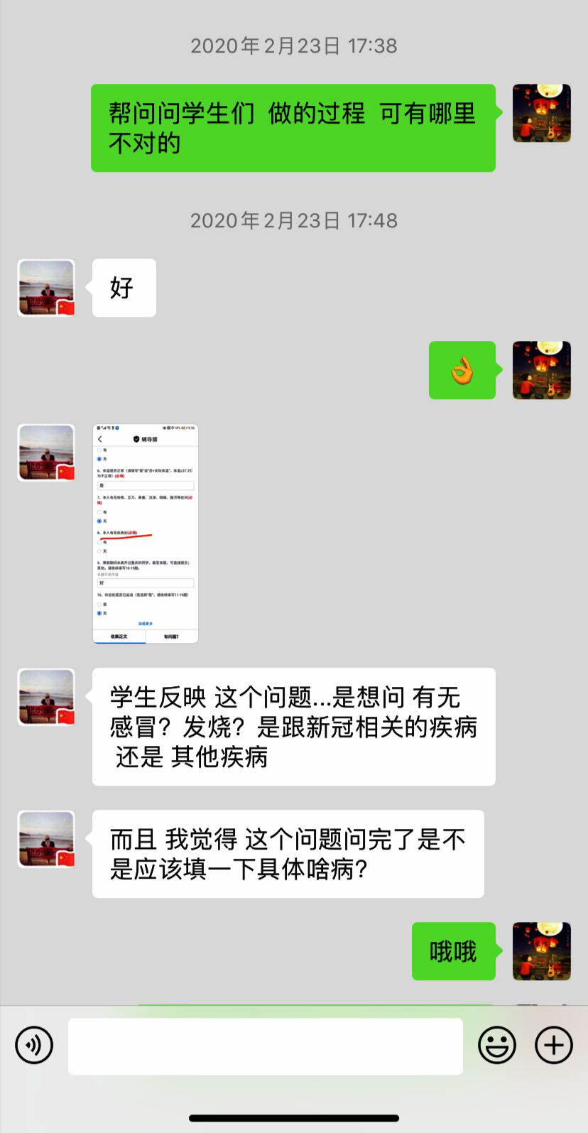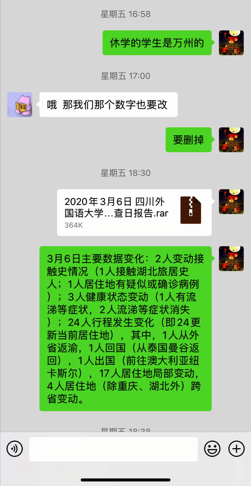 每天,王学东都要收集学生的接触史情况、健康情况(有无感冒发烧等症状)、行程情况(每日返渝、出国、回国、居住地变更等)等方面的数据。他每日晚间通过辅导猫发布问卷收集当日基础数据,经初步数据处理后,反馈待核定数据,经摸排核准后,汇总统计生成当日数据。