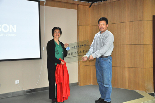 随后,德语教师发展中心主任徐利老师发言,她对中心的宗旨、目标、任务等多个方面进行了详细介绍。她说,中心的指导思想是促进教学、促进科研、成就教师、惠及学生。中心成立后,要联系西南地区所有德语教学单位,了解他们的德语教学、教师特点,有针对性地开展德语教师发展工作,研究前沿的教学方法和教学理念,探索德语教师人才培养发展的有效途径。她还从教学能力、科研能力、交流平台、人文关怀等方面阐释了中心建成后的具体工作范围。