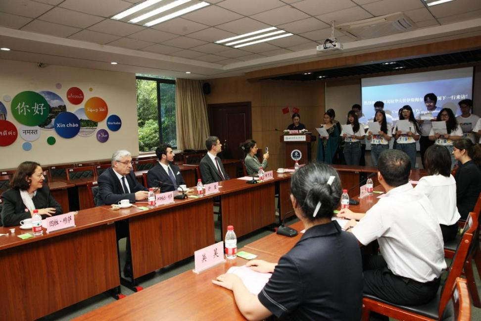 会后,伊斯梅尔·穆萨一行前往东方语言文化学院与土耳其语专业师生交流。土耳其语专业学生以一首土耳其语歌曲对大使一行表示欢迎。在交流环节,学院党总支书记廖礼彬表示,土耳其语是我校拓展非英语办学的一个重要阵地,专业年轻但已取得不错成果。希望在社会各界的支持下,专业发展更快更稳,为中土交流作出更大贡献。