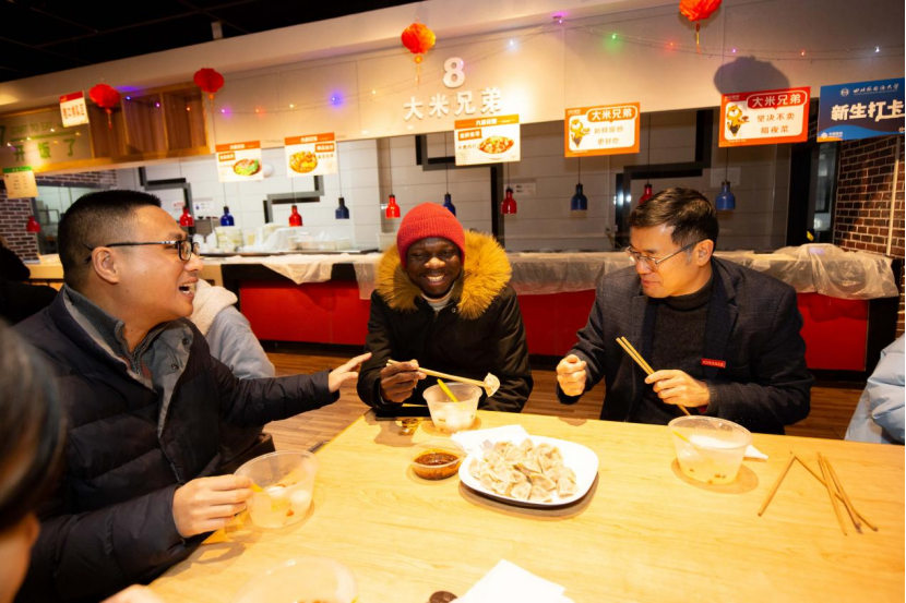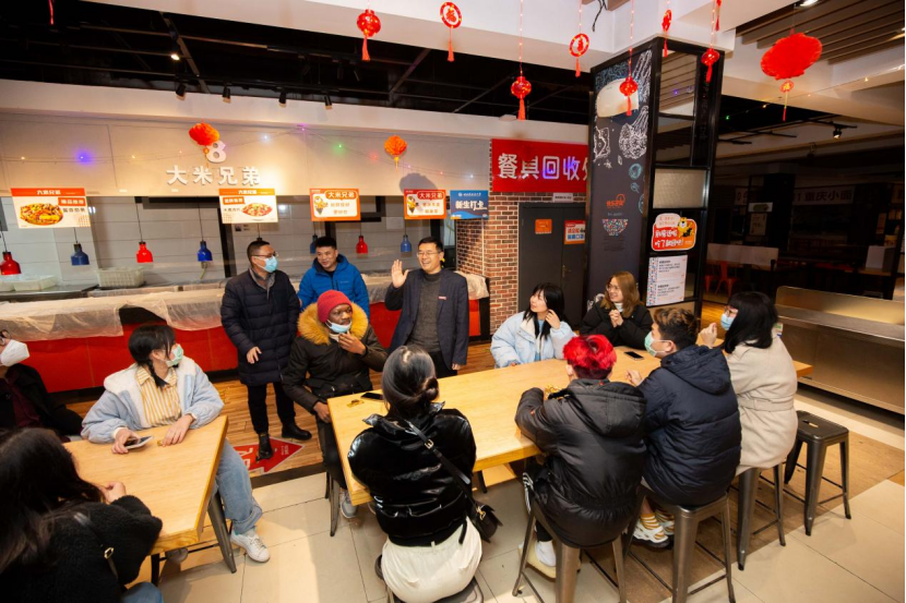 邹渝书记还专门邀请来自俄罗斯、刚果(布)、泰国、越南、菲律宾、印尼等国家的留学生座谈交流,并邀请同学们一起吃汤圆、饺子等传统美食。邹渝向留学生们介绍了中国传统新春佳节的文化知识,并祝愿大家在新的一年扬眉“兔”气,“兔”飞猛进,大展红“兔”。邹渝表示,学校高度重视留学生入境返校工作,关心、关爱留学生的适应情况与日常生活需求。留学生们既开心又感动,感谢学校领导、老师无微不至的关心与亲切的慰问,表示会珍惜寒假在校期间的宝贵时光,勤奋学习、增长才干,学有所成,成为促进中外文化交流的使者,更好地把中国介绍给世界。