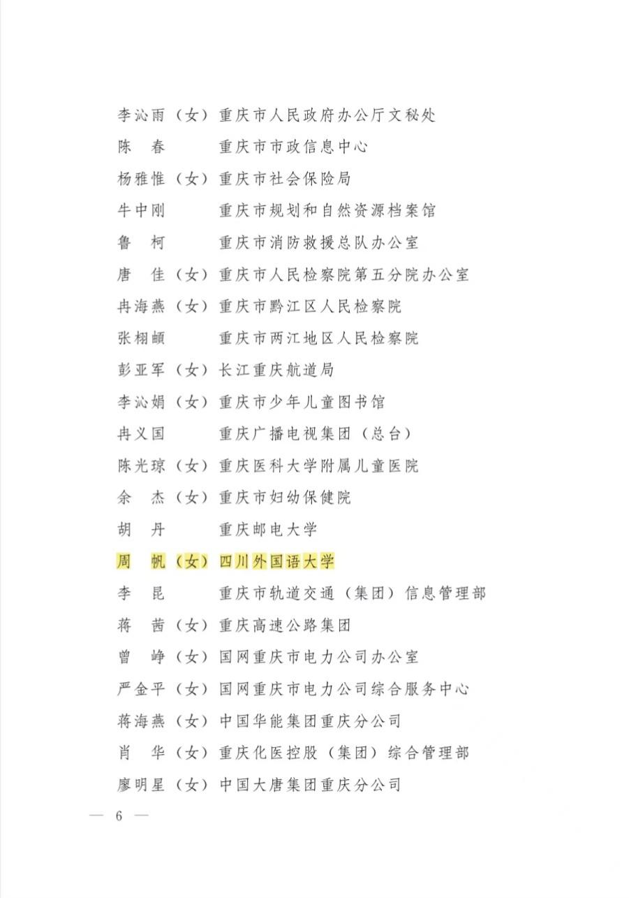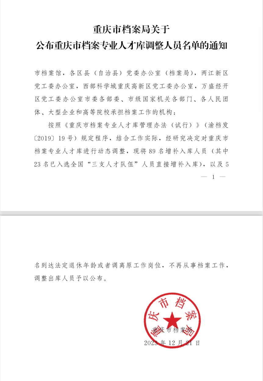 近日,重庆市档案局发布了《重庆市档案局关于公布重庆市档案专业人才库调整人员名单的通知》(渝档发〔2023〕20号),我校图书馆(档案馆)周帆同志入选“重庆市档案专业人才”。