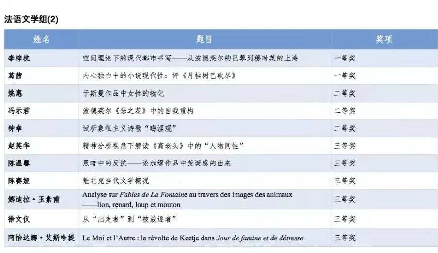 2020级学硕李梓杭(导师:文雅教授)凭借论文《空间理论下的现代都市书写——从波德莱尔的巴黎到穆时英的上海》荣获法语文学2组一等奖;