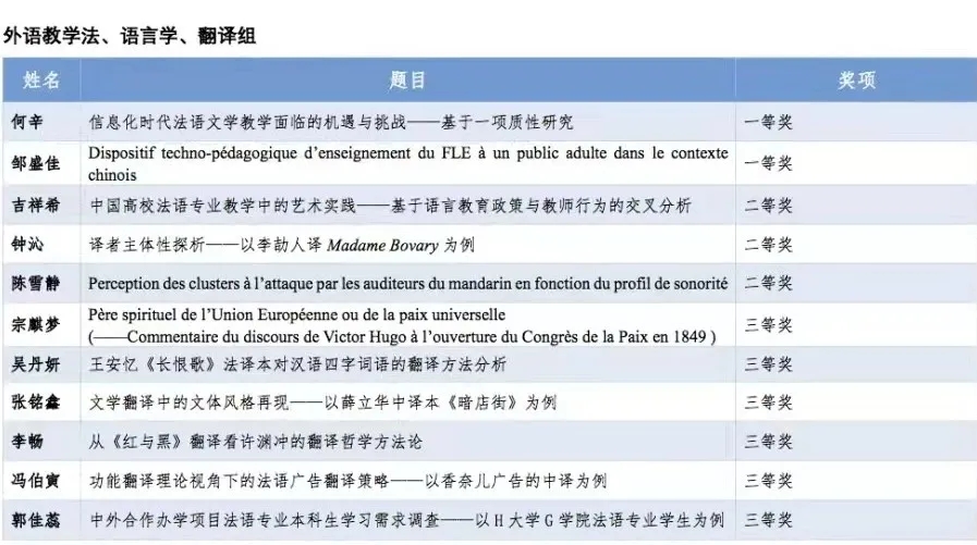 2021级学硕郭佳蕊(导师:杨艳如教授)凭借论文《中外合作办学项目法语专业本科生学习需求调查——以H大学G学院法语专业学生为例》荣获外语教学法、语言学、翻译组三等奖。