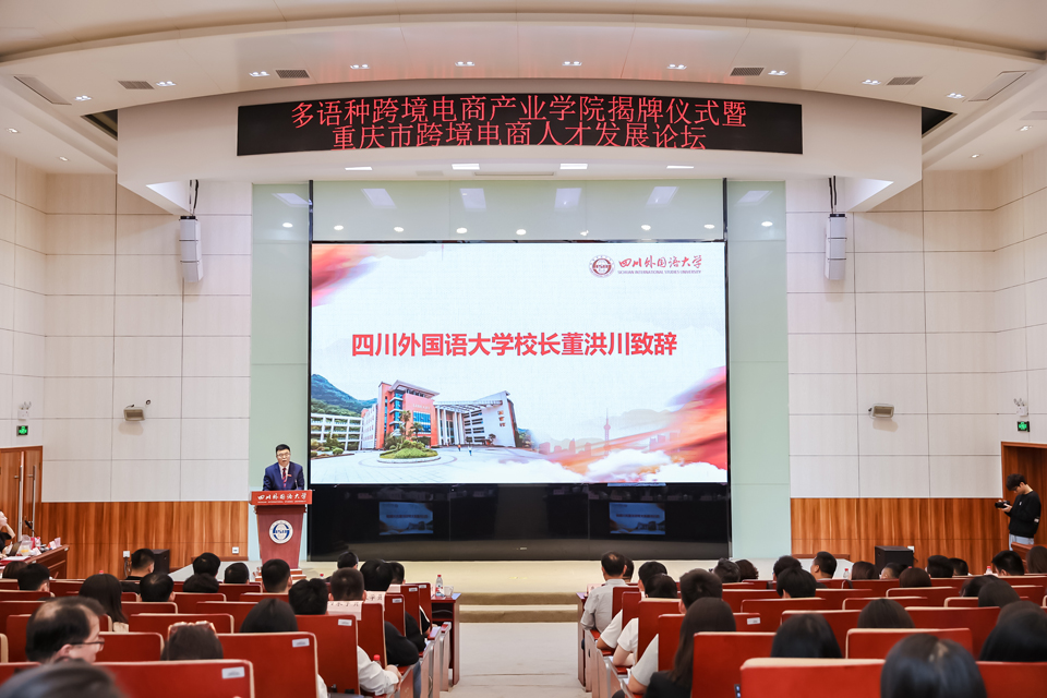4月26日,多语种跨境电商产业学院揭牌仪式暨重庆市跨境电商人才发展论坛在我校国际报告厅隆重举行。董洪川校长、严功军副校长,重庆市商务委员会外贸管理处李国田处长,新加坡阿朗斯投资集团主席、重庆市跨境电子商务协会会长廖洪海,中新(重庆)跨境电商产业园项目总经理王利刚,北京盛伦国际物流集团CEO姜维明,亚马逊、Shopee等30多家知名跨境电商企业负责人,川外重庆校友会校友代表,我校校地合作处蒋晓丽处长、国际工商管理学院、商务英语学院、西方语言文化学院、东方语言文化学院等相关院系负责人以及师生代表200余人出席了本次活动。