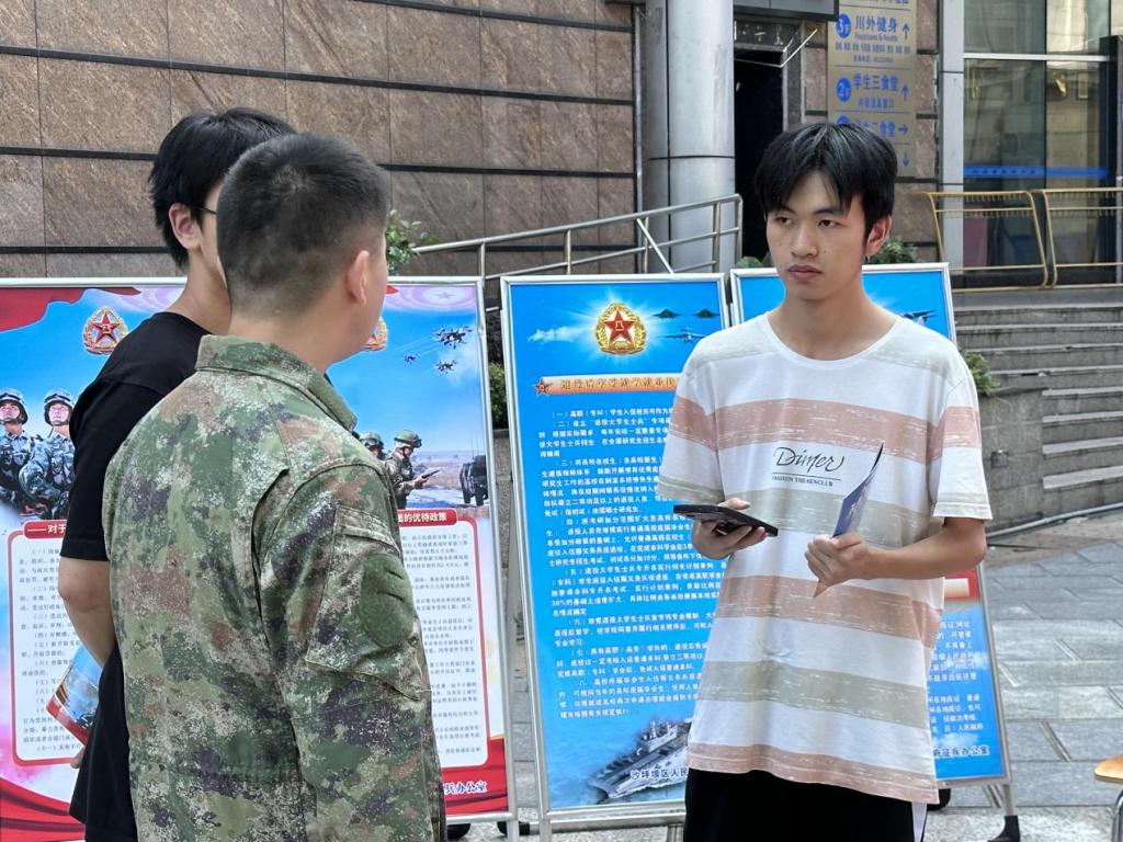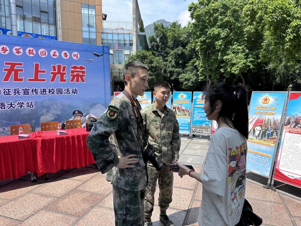 此次征兵宣传现场气氛火热,同学们积极主动咨询,了解报名条件、体检项目及优惠政策后,爱国之情油然而生,投身军营的热情高涨。