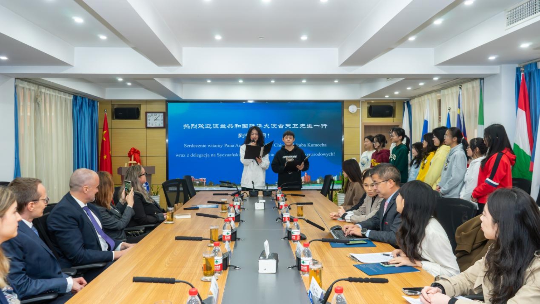 12月2日下午,波兰驻华大使古天卫、波兰驻成都总领事狄时籁一行来访我校,重庆市外办欧非处处长李岚、干部尹诃陪同来访。党委书记邹渝、党委副书记苟朝莉与来宾会见,国际合作与交流处、西方语言文化学院相关负责人参与接待。