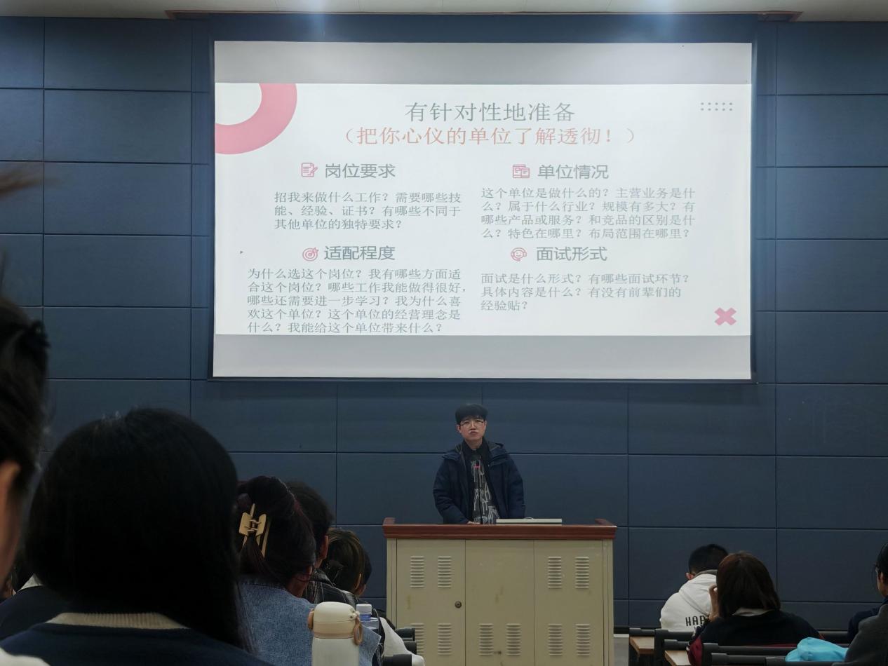正向引导,多举措助力学生高质量就业。英语学院辅导员结合学校建校75周年的学风建设年定位以及deepseek等AI科技对语言专业的冲击与挑战进行分析,找到语言专业同学的机遇与应对方式,并介绍相关实习实践项目,希望同学们在实践中提升专业与综合素质。马克思主义学院辅导员深入分析当前就业形势,鼓励同学们“早准备、多实践”,并邀请有经验的老师为学生分享事业单位备考经验。翻译学院辅导员围绕衣着礼仪、肢体语言等细节,到临场应变技巧、面试高频问题回答策略等,与同学们分享了面试中的注意事项以及面试技巧。