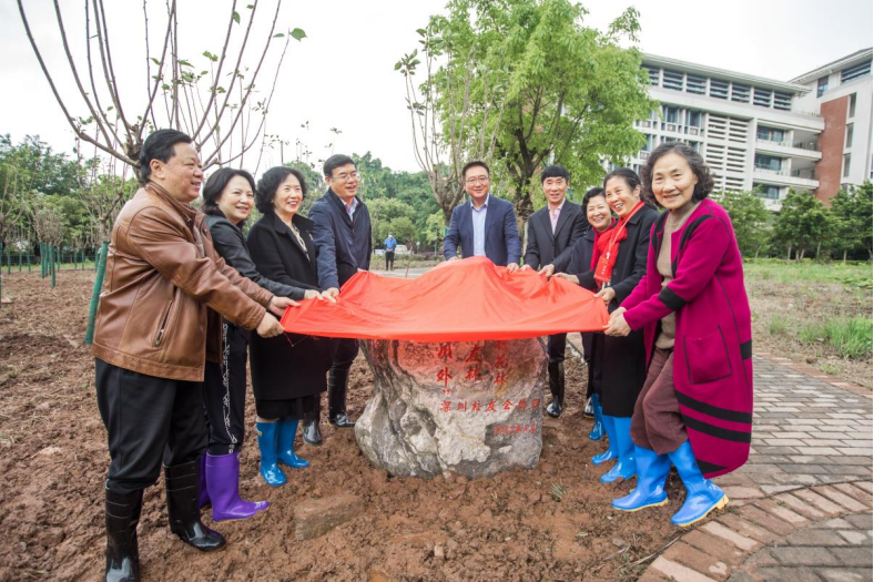 在现场热烈的掌声中,邹渝书记与校友代表们共同为樱花林碑石揭幕,标志着“我爱川外”校友林建设项目的正式启动。
