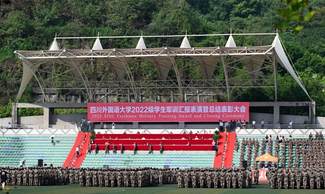 9月30日,四川外国语大学2022级新生军训汇报表演暨总结表彰大会在西区运动场举行。校长董洪川,副校长卢波、李彦、祝朝伟,纪委书记杨国祥,武警重庆总队机动支队领导,学校各职能部门、各学院负责人,军训团指挥组成员及全体参训师生、承训教官参加大会。大会由李彦主持。