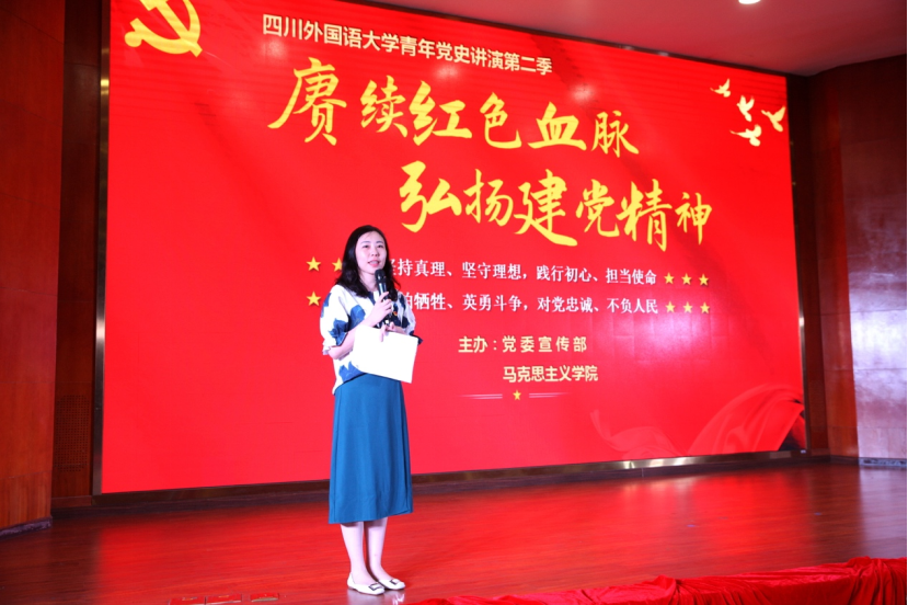 活动最后,党委书记邹渝对本次活动的形式和效果给予高度肯定。他表示,本次活动以党史历程为主线,以一个个鲜明的党史人物为坐标,对“32”个字伟大建党精神做了生动具体的诠释。同学们的讲演不仅仅是对党史故事的演绎,更是一堂充满了教育意义以及正能量的思政课。他鼓励党史讲演团再接再厉,深入挖掘身边的事例,从四川外国语大学奋进的历程中寻找和深挖“身边的榜样故事”,感染和激励广大师生。他同时希望青年大学生在奋进新征程建功新时代的过程中,都应当深入学习宣传先辈们先进事迹,发挥先进模范作用,争做新时代有为新青年。