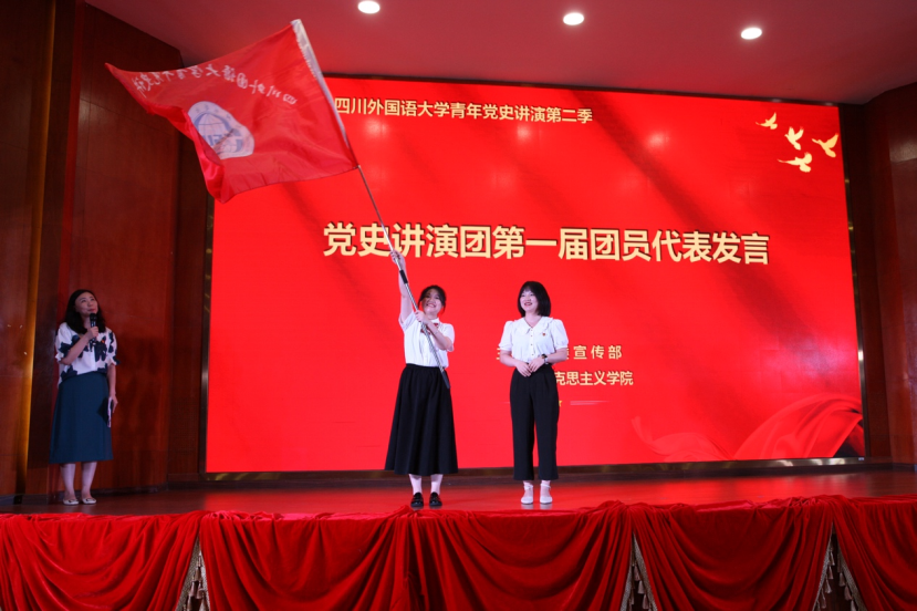 活动现场还举行了社团旗帜传递仪式。即将毕业的第一届党史讲演团成员吴丽芳将社团旗帜传递到第二届成员胡亮手中,并希望青年党史讲演团能够在学弟学妹们的团结努力下,将青年党史讲演团打造成为同学们一起学习进步的集体,打造成马克思主义学院实践育人的阵地,打造成学校党史学习教育长效化常态化的平台。