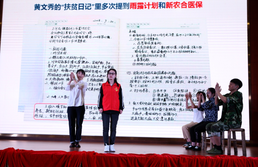 第四个故事还原了“七一勋章”获得者、时代楷模、广西壮族自治区百坭村驻村第一书记黄文秀生平事迹。同学们演绎了黄文秀与父亲在天安门前许下的归乡承诺,在脱贫战场上立下“不获全胜、决不收兵”的铿锵誓言,在生命最后一刻前与年迈父母依依惜别。节目中也展现了我校9位驻乡驻村干部的先进事迹,以此号召青年一代要自觉把人生追求与党的事业紧密联系在一起,与时代同步伐、与人民共命运,积极投身到党和人民最需要的地方和工作中去。