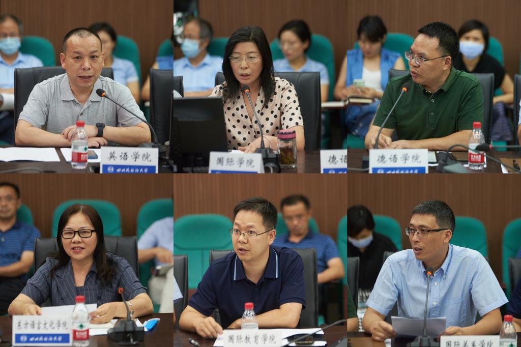 英语学院副院长谭春、国际学院院长曾传芳、德语学院院长李大雪、国际关系学院副院长宋国华、国际教育学院院长龙洋、东方语言文化学院院长罗文青围绕新学期开学教学准备、补缓考、研究生推免、“三进”全面推进工作进了主题交流发言。
