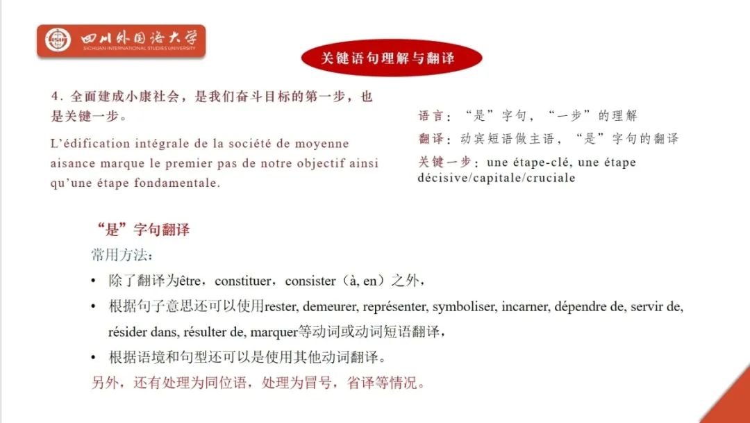 在教学示范环节,刘帅锋副院长以《理解当代中国:汉法翻译教程》第四单元“中国特色社会主义事业总体布局和战略布局”为示范,介绍了法语学院当前“三进”工作开展的情况,并从教学目标、教学设计、核心概念解读、关键语句理解与翻译、重点段落分析与翻译、重点词汇和表达方式、长限定成分的处理方法、无主语句、教学实践开展情况以及学生收获十个方面进行了示范分享。
