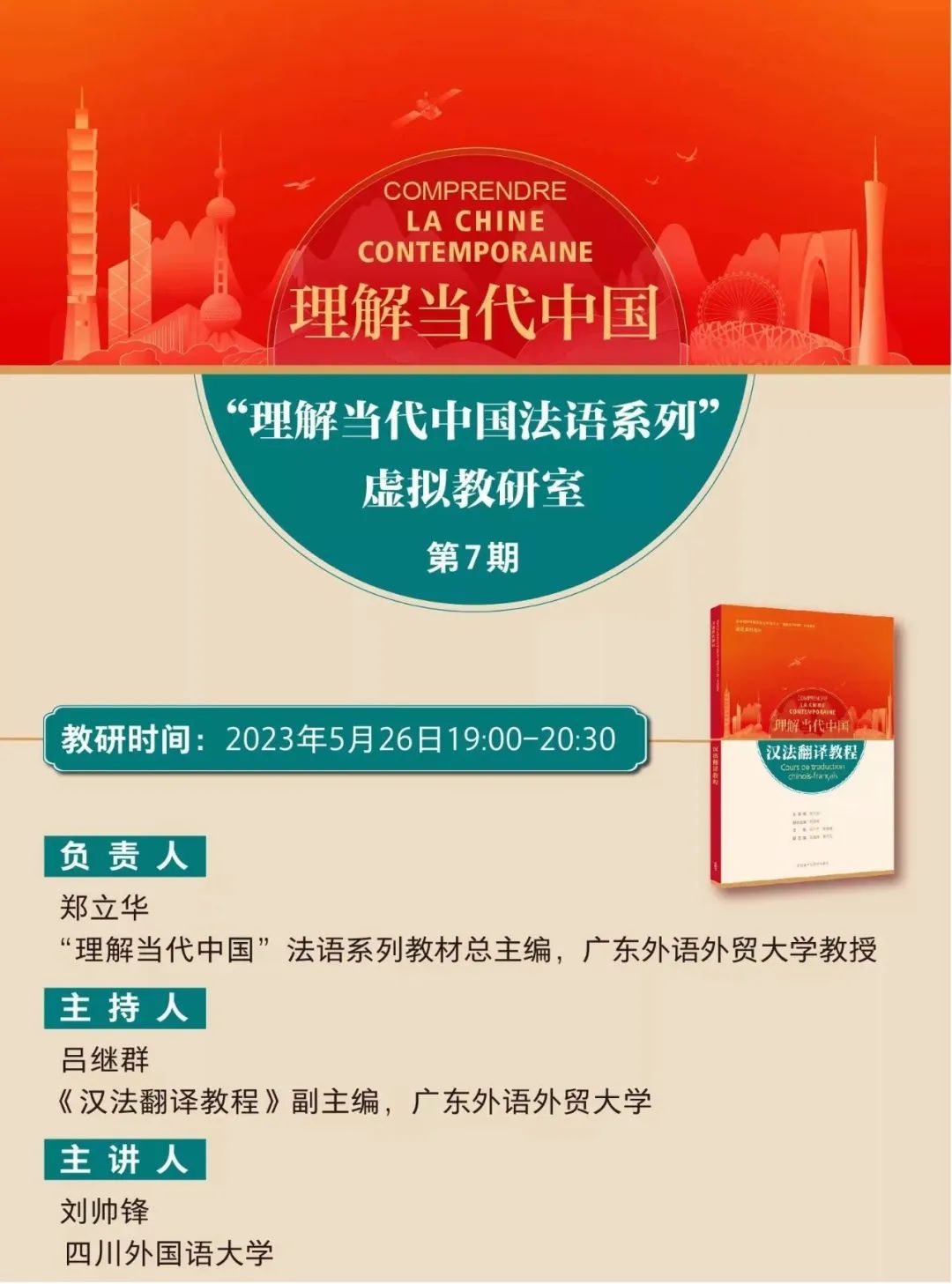 5月26日19点,我校法语学院刘帅锋副院长受邀担任全国“理解当代中国法语系列”虚拟教研室第7期教研会主讲。教研会由《理解当代中国:汉法翻译教程》副主编、广东外语外贸大学吕继群老师主持。来自全国各地的法语专业教师在线参与教研活动。活动主要包括教学示范和研讨交流两个环节。