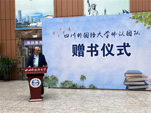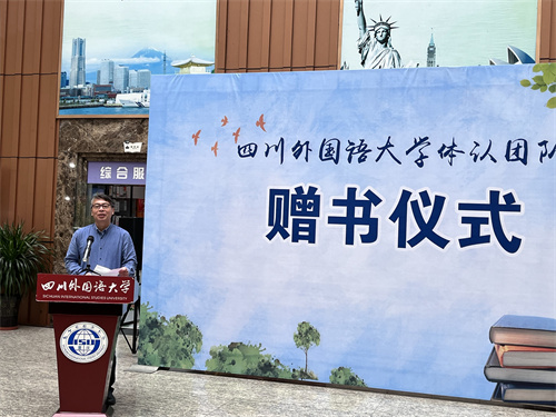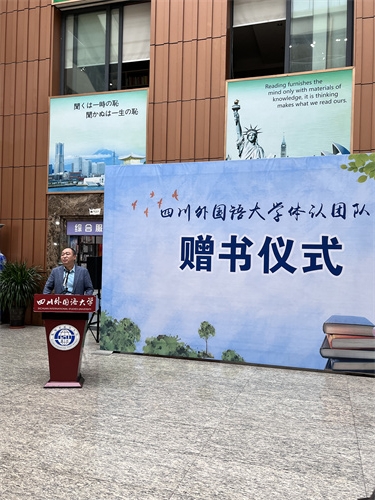紧接着王寅教授发言。他表示学科发展需要依靠团队力量。体认团队多年来致力于认知语言学本土化研究,团队收集了相关书籍共76套,每套各2本,总共150余本。此外,团队成员所作的几百篇论文也修订成4本论文集,一同捐赠给图书馆。王寅教授指出,在世界读书日进行赠书,使得赠书仪式更多了一层含义。他谦虚地说道:“愿微薄的科研成果,能够为提升川外科研水平作一点点贡献。”