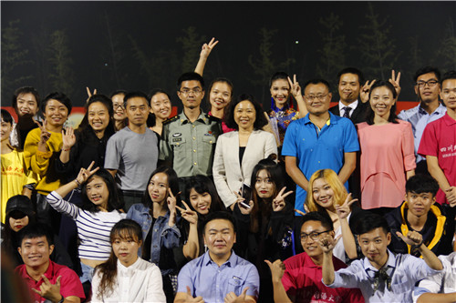 | 晚会现场校领导、军训团领导与职能部门负责人和参演同学合影 |