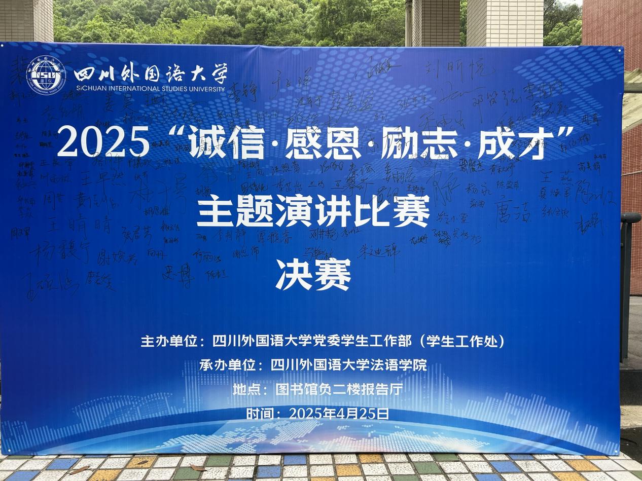 4月25日下午,四川外国语大学2025年“心光·砺行”诚信教育主题演讲比赛在图书馆负二楼学术报告厅落下帷幕。经过初赛的激烈角逐,来自15个学院的16位选手站上决赛舞台,以真挚的语言、深刻的思考与生动的故事,诠释新时代青年对诚信精神的坚守与传承。