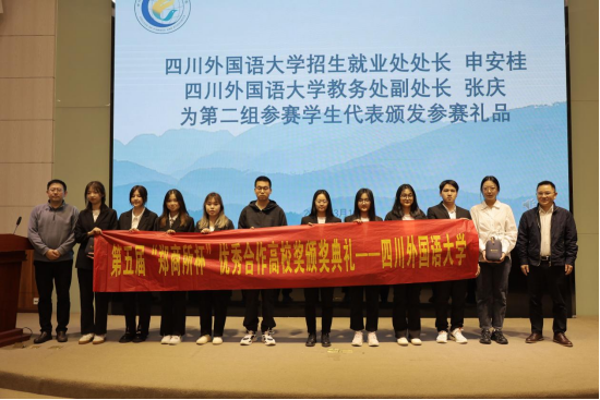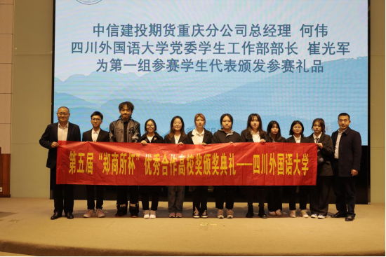活动现场,由中信建投期货副总经理卢友中代表郑州商品交易所为四川外国语大学颁发第五届“郑商所杯”——“优秀合作高校奖”荣誉证书;四川外国语大学党委学生工作部部长崔光军、招生就业处处长申安桂、四川外国语大学教务处副处长张庆、中信建投期货重庆分公司总经理何伟为参赛学生代表颁发礼品。