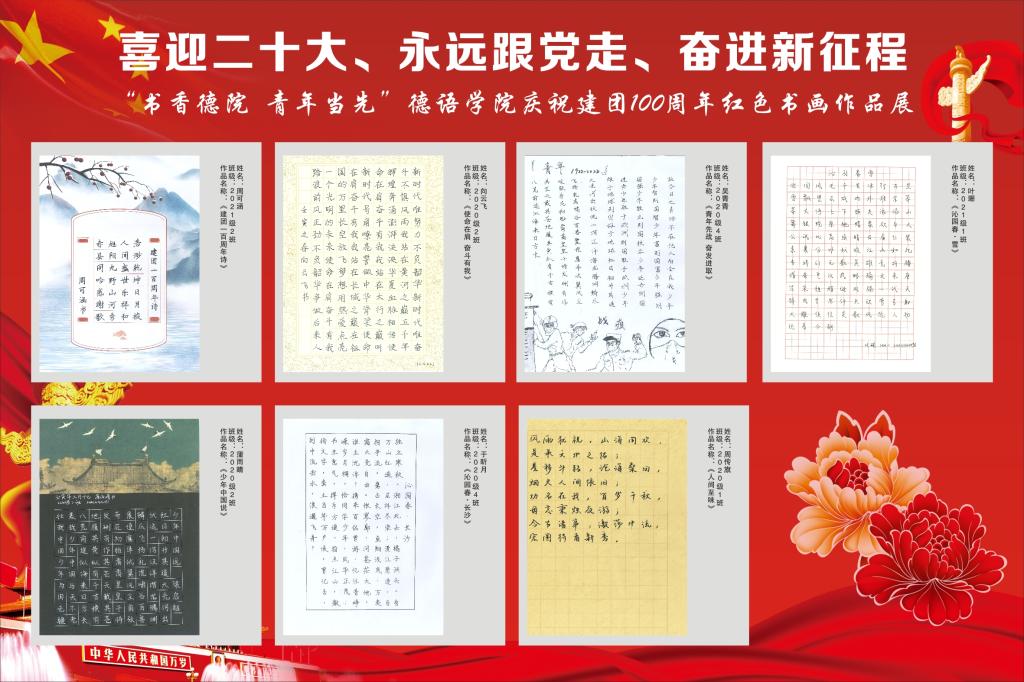 2022年4月25日,《奋斗百年路,启航新征程》等红色书画作品正式在西区立德楼C栋3楼展出。本次“书香德院 青年当先”红色书画作品展共有18幅作品,包括软笔书法、硬笔书法及原创绘画等。