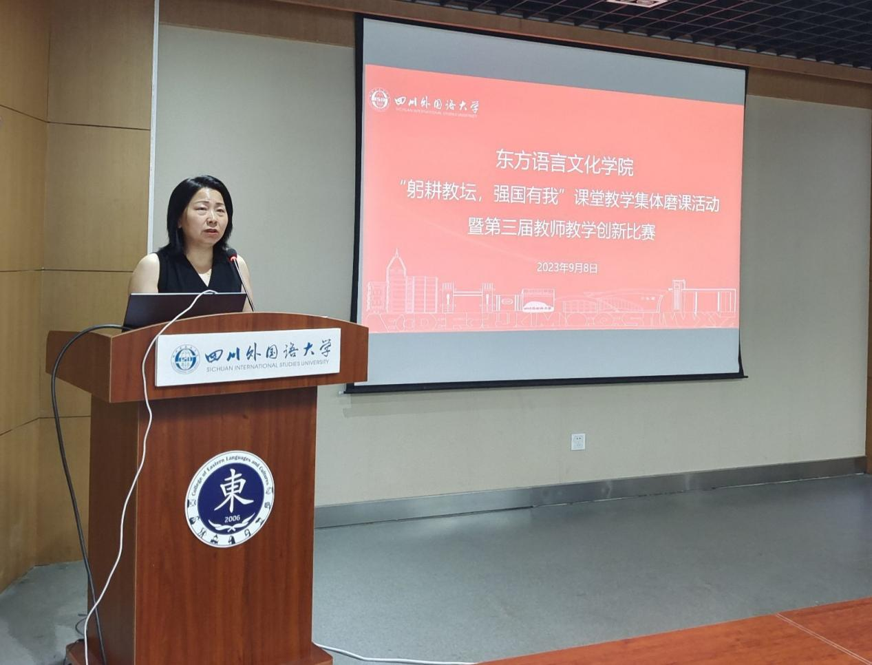 教务处刘玉梅处长在赛前致辞中对东方语言文化学院取得的成绩表示了祝贺,她指出磨课的过程是学习、研究、实践的过程,是教师专业素养提升的过程,希望各位老师理解并处理好“专业与课程的关系、课程与教材的关系、课堂与实践的关系”,在新文科建设中取得更多更优异的成绩。
