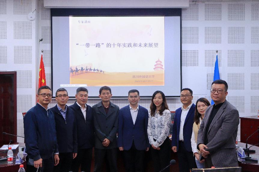 2023年10月25日晚,中共重庆市委外事工作委员会办公室秘书处处长冯仁勇博士、中央外事工作委员会办公室定点帮扶彭水苗族土家族自治县挂职副县长刘钰、渝新欧(重庆)供应链管理有限公司副总经理白仁毅、北京大学燕京学堂行政办主任陆晨源莅临我校开展题为“‘一带一路’的十年实践和未来展望”的主旨学术讲座与交流会。讲座由校科研处王伟处长致辞,国际法学与社会学院院长林移刚、国际关系学院院长宋国华共同主持。会后,严功军副校长与讲座专家就“一带一路”国际传播等话题进行了深入交流。我校社会学专业郑昊副教授、谭霞博士,法律专业温融副教授,以及法社、国关两院研究生100余人参与了此次讲座。