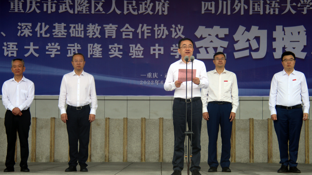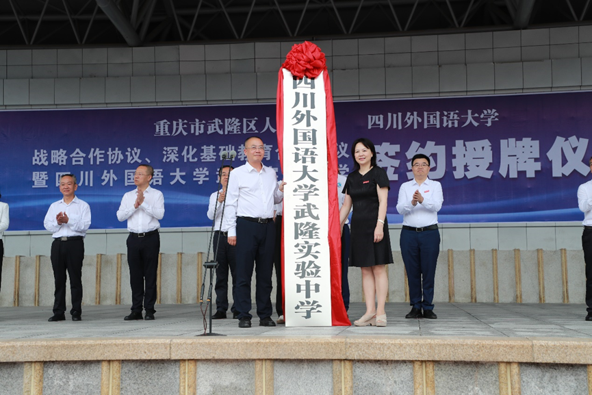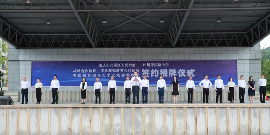 6月17日,学校与武隆区人民政府战略合作协议、深化基础教育合作协议签约暨四川外国语大学武隆实验中学授牌仪式在武隆中学举行,双方携手拉开了共建共荣、共享共赢的校地合作发展新篇章。学校党委书记邹渝,校长董洪川,党委副书记苟朝莉,党委常委、副校长卢波、李彦,武隆区委书记何庆、区长左军、区人大常委会主任杨国权、区政协主席王频、区政府副区长刘印、区政协副主席刘壮等出席活动。