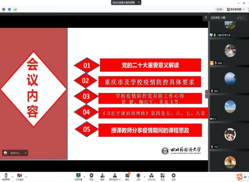 党支部科学部署处置力量。一是科学分配任务。党支部按照“三三三”处置工作任务分配方针开展工作,即现有的13位党员中,曾健、陶红军、董竞飞、徐新鹏等4位同志作为第一梯队部署在抗疫一线,高福霞、翟浩淼等4位同志作为第二梯队随时待命,其余同志作为预备队做好线上授课以及学生情绪疏导工作;二是积极宣传动员。疫情发生后,支部多位教师主动投入到一线防控工作中来,同时带动了学院日本籍外教毛卫兵老师也加入了志愿者行列。10月14日晚,支部召开十月份主题党日活动,全体党员准时上线参会,支部书记徐新鹏解读了即将召开中国共产党第二十次全国代表大会的重要意义,并带领大家学习了重庆市和学校疫情防控政策,支部安排曾健、陶红军、董竞飞等正处在处置一线的同志分享了心得体会,让大家感同身受,极大的增强了支部党员的工作热情,增强了组织凝聚力和号召力。