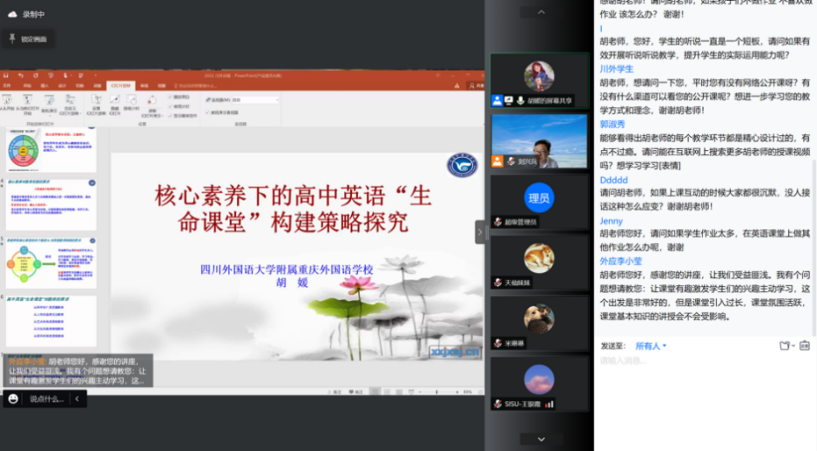 4月27日下午14:30,四川外国语大学附属重庆外国语学校市级特级教师、重庆名师、重庆市中小学英语学科带头人胡媛老师应邀为我校师生开展了一场题为“核心素养下的高中英语‘生命课堂’构建策略探究”的线上专题讲座,启动了我校“研究生核心职业能力提升”系列活动。讲座由研究生院主办,英语学院承办。研究生院副院长刘兴兵教授主持讲座,近200位师生参加本次讲座。