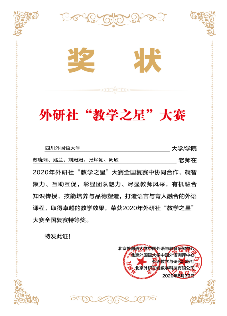 8月18-19日,2020年“教学之星”全国半决赛以全国线上直播方式举行,本次参赛继续沿用2019年团队模式,主题为“语言与育人融合的外语课程与教学设计”。我校大外部参赛团队由苏晓俐、姚兰、刘姗姗、张烨颖、周欣等五位老师组成,团队继6月份夺得全国复赛重庆赛区特等奖后,再次以优异的成绩获得本次全国半决赛一等奖。