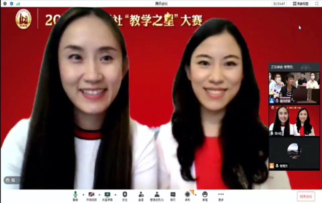全国半决赛分为两个环节:播放说课及教学视频、现场连线回答问题。时长5分钟的说课视频由团队负责人苏晓俐老师录制,10分钟的教学视频由姚兰老师录制,视频播放后,两位教师与提问评委连线进行了6分钟的现场问答。我校大外部教师秉持混合金课“两性一度”的高标准,强调教学内容的高阶性、创新性、挑战度,在团队的共同努力下最终荣获全国半决赛一等奖。
