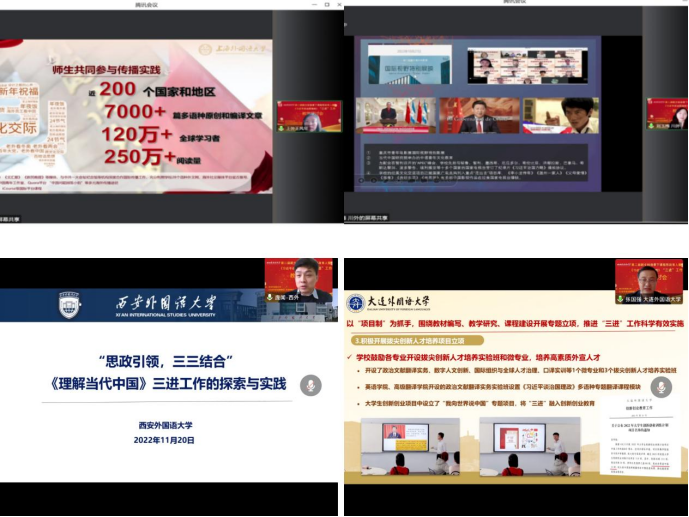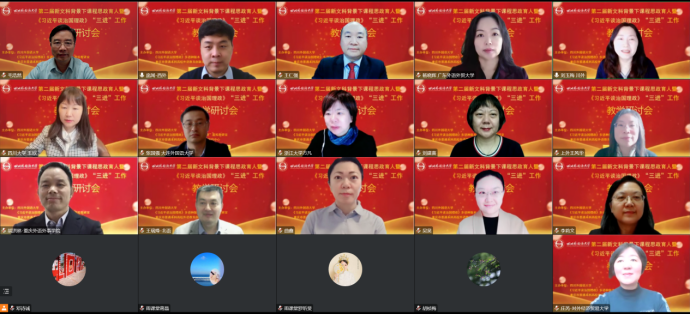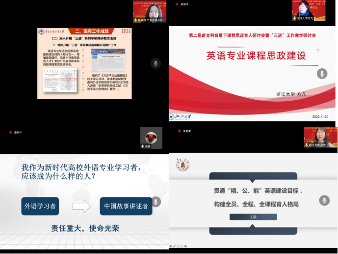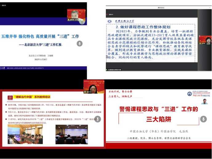 围绕“新文科背景下外语课程思政的探索与实践”“外语类院校推进‘三进’工作的理念与实践”“《理解当代中国》系列课程设计理念与实践”主题,上海外国语大学教务处处长王风华、四川外国语大学教务处处长刘玉梅、西安外国语大学教务处处长庞闻、大连外国语大学教务处处长张国强、北京语言大学教务处处长王瑞峰,天津外国语大学教务处处长刘建喜,北京外国语大学教务处处长李莉文、中国石油大学(华东)外国语学院院长毛浩然、广东外语外贸大学日语学院院长杨晓辉、浙江大学外语学院英语系主任方凡、四川外国语大学东方语言文化学院副院长吴昊、四川大学外国语学院院长王欣等来自11所高校的12位专家带来了12场精彩主题报告。北京第二外国语学院教务处处长曲鑫、对外经济贸易大学教务处处长庄芮、重庆外语外事学院教务处处长胡洪林分别主持了主旨报告环节。12场报告从学校顶层设计理念、工作路径方法、工作内容实效、存在的问题与不足等方面分享了新文科理念和背景下课程思政建设和“三进”工作的实践经验和成果。会后,与会代表纷纷表示受益匪浅,报告精彩纷呈,各高校紧密围绕立德树人总目标,“三进”、课程思政融入到学科专业建设、新文科教育教学改革等重点育人工作中,构建校本特色课程思政、“三进”工作模式,具有借鉴意义。
