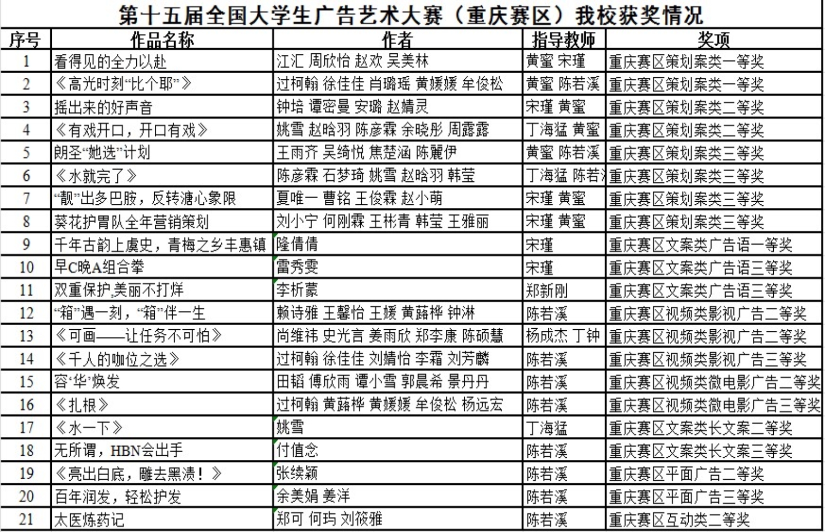 在近日举行的第十五届全国大学生广告艺术大赛(重庆赛区)中,我校学生在划案类、文案类广告语、视频类影视广告、视频类微电影广告、文案类长文案、平面广告、互动类获得奖项共计21件,其中一等奖3件、二等奖8件、三等奖10件(详细获奖名单见后)。同时,我校教师陈若溪、黄蜜、宋瑾荣获重庆赛区优秀指导老师。