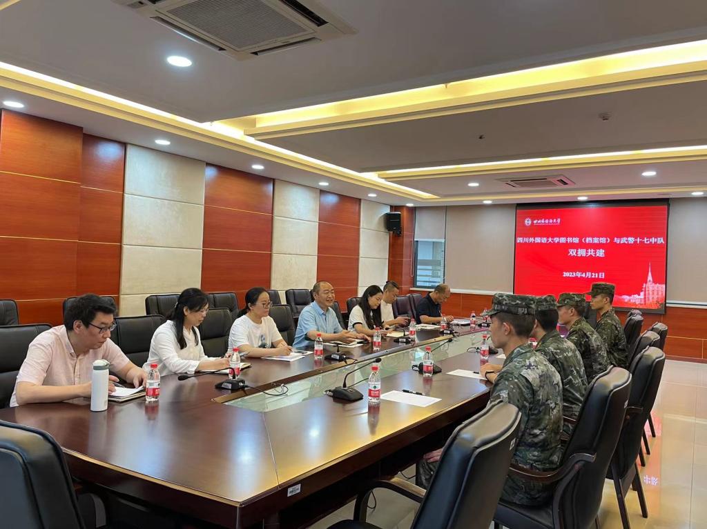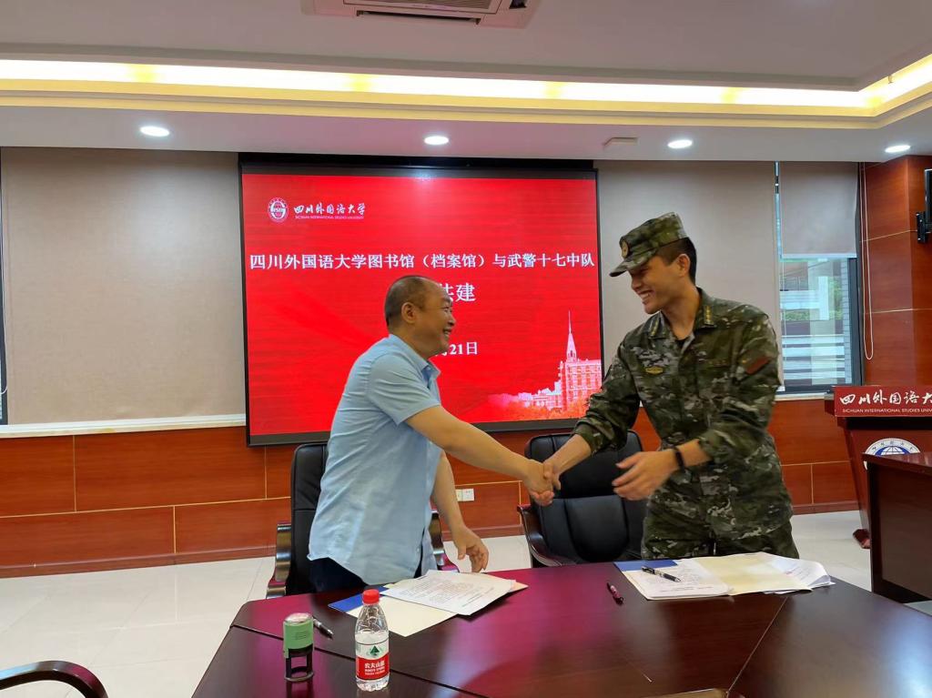 为深入学习贯彻党的二十大精神,全面推进高校图书馆“全民阅读”工作,提升官兵文化素养,4月21日,四川外国语大学图书馆(档案馆)与武警十七中队开展了军民融合共建“书香军营”活动。本次活动在图书馆505会议室举行,图书馆(档案馆)馆长杨俊主持活动,武警执勤五大队副指导员肖华、武警十七中队指导员周阳阳、图书馆各部室主任等参与本次活动。双方本着充分发挥各自优势、共建共享、互帮互助原则,结为“双拥共建单位”。