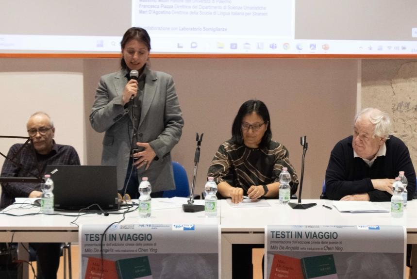 2023年4月27下午,米洛·德·安杰利斯诗集《相遇与埋伏》中文版首发式在意大利巴勒莫大学的古建筑圣安东尼诺楼举行。德·安杰利斯是目前最有影响力的意大利诗人之一,这本诗集通过人民文学出版社出版,由四川外国语大学西方语言文化学院陈英教授翻译,诗人和译者都参加了这次题为“文本的旅行”的发布会。