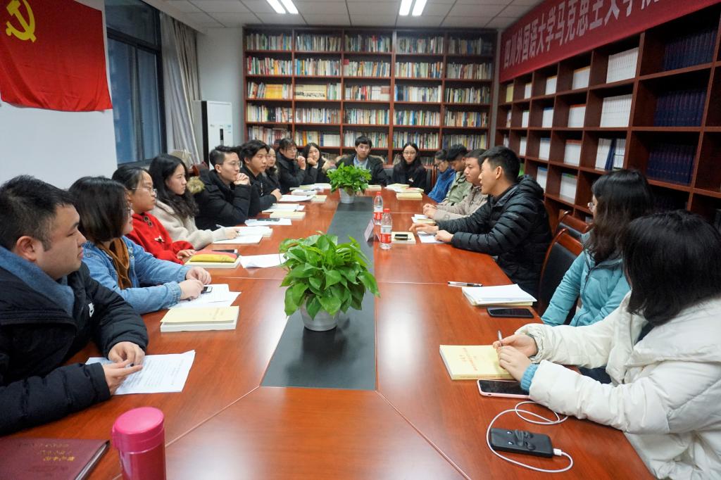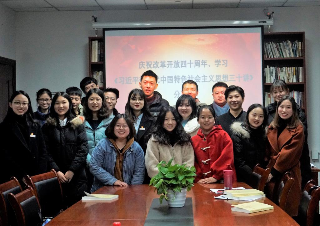 2018年12月21日下午3点,《习近平新时代中国特色社会主义思想三十讲》改革开放专题学习读书会在行政楼B503会议室如期举行。党委宣传统战部副部长官晴华,指导教师冯波、孙诗寒,马克思主义学院研究生、本期青马工程红岩团校参训学员等近30人参加。