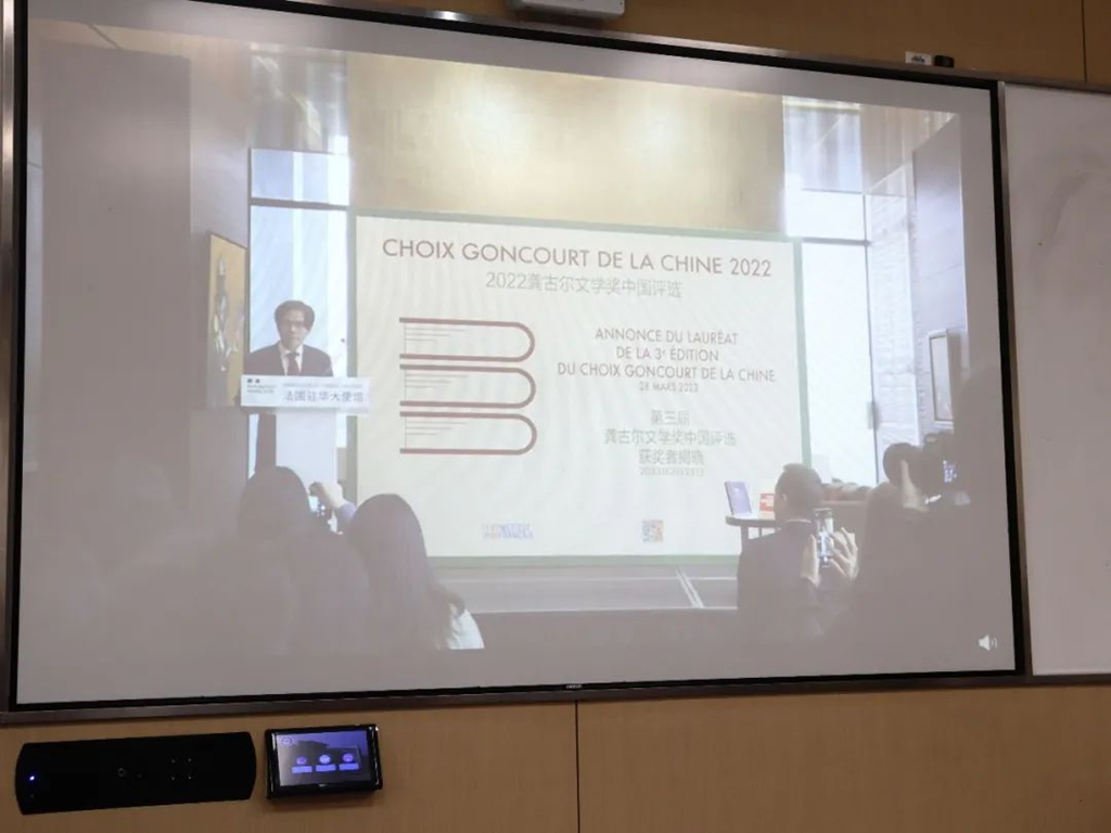颁奖典礼首先由白玉堂大使致辞。他依次介绍了龚古尔文学奖的简要历史及重要性,宣布了最终获奖作品并表示该作品的中文译本将在不久后面世,最后对参与本次评选的老师及同学们表达了感谢,并期待明年再会。