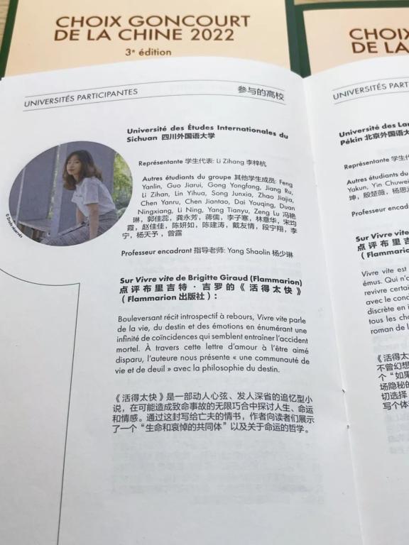 在院长、党总支书记杨少琳教授的指导下,川外评审团先从8部作品中选出4部进入第二轮评选,最终从进入第二轮评选的4部作品中选出布里吉特·吉罗女士(Brigitte Giraud)的《活得太快》(Vivre Vite),投出了庄严的一票。其余3部入围第二轮评选的作家及作品是:纳当·德维尔的《人工连接》、马肯齐·奥尔塞尔的《人的总和》和帕斯卡勒·罗贝尔—迪亚尔的《小骗子》。