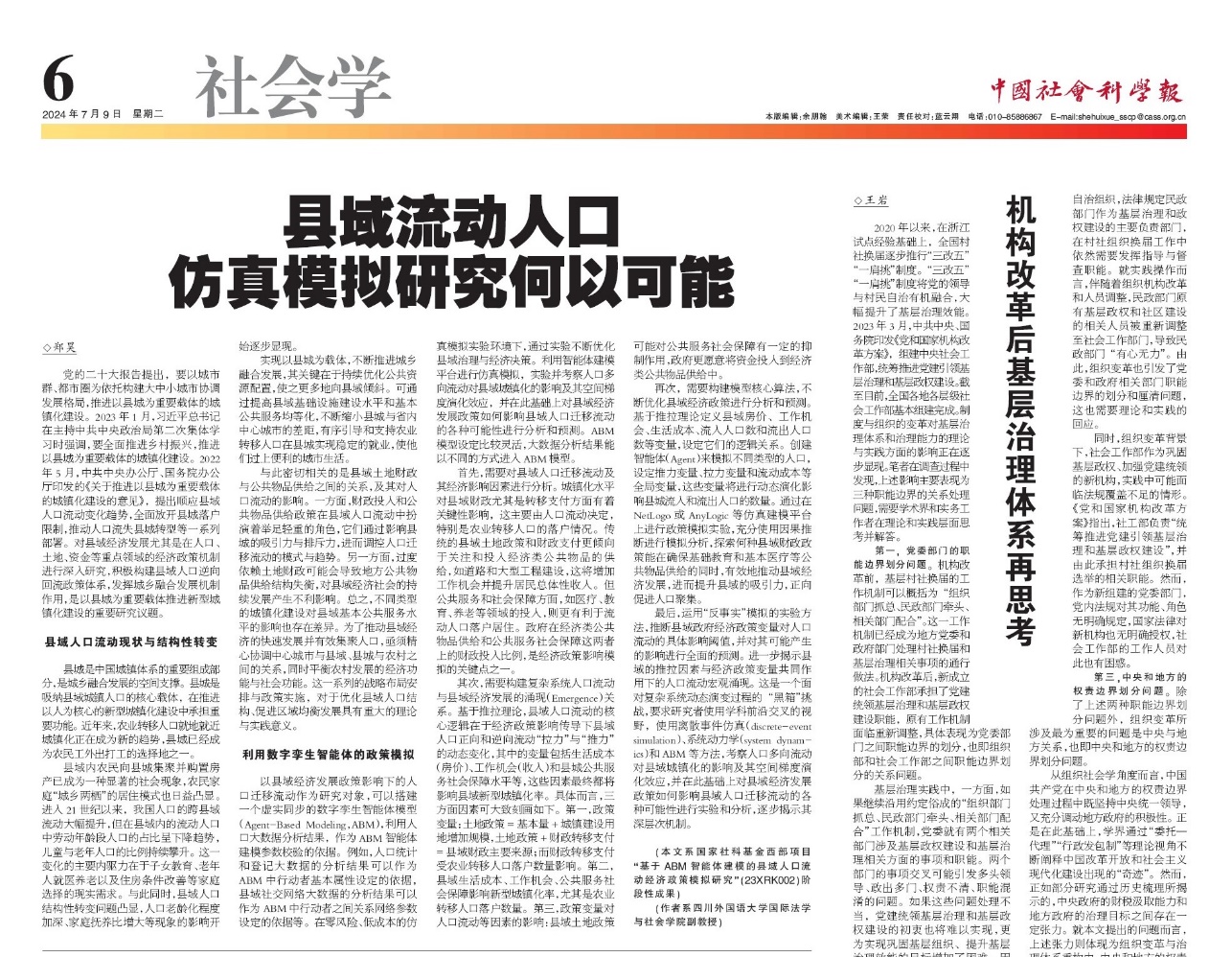 近日,国际法学与社会学院郑昊副教授在《中国社会科学报》社会学专版上发表了题为《县域流动人口仿真模拟研究何以可能》的跨学科研究性文章。该研究作为国家社科基金西部项目(23XRK002)的阶段性成果,不仅展现了在新文科交叉学科和数字化转型领域的前沿探索,也是学院近年来在新文科建设中着力推动法学、社会学、社会工作等学科交叉融合和数字化研究转型的有效实践。