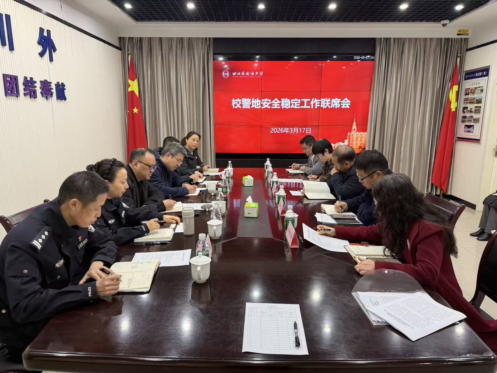 为全面贯彻落实上级关于校园安全稳定工作的决策部署,精准防范化解涉校涉生安全风险,确保春季学期开学平稳有序,3月17日上午,学校在东区保卫处会议室召开校警地安全稳定工作联席会。副校长张北坪主持会议并讲话。