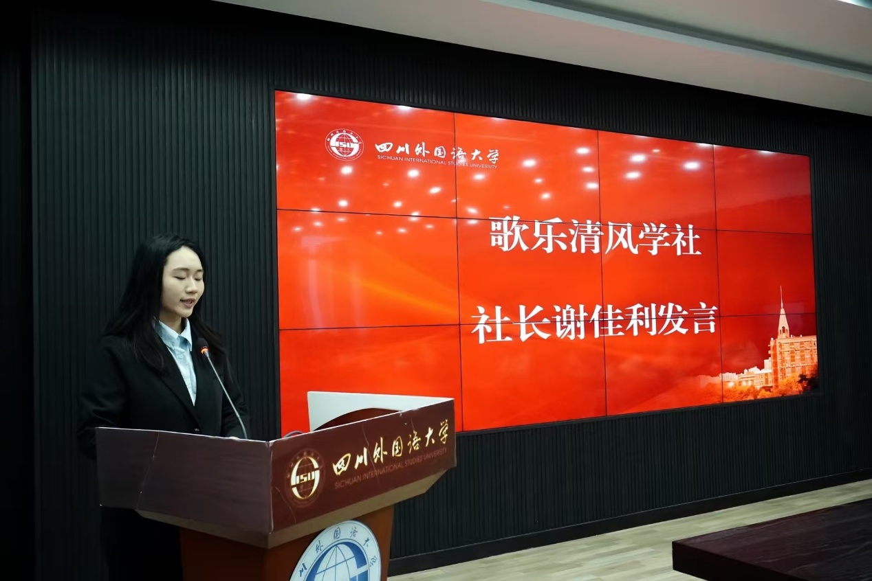 歌乐清风学社社长谢佳利同学发言,指出歌乐清风学社是在学校纪检监察机构指导下成立的思想政治类社团,致力于校园廉洁教育,未来将通过举办廉洁讲座、开展国际文化交流、组织趣味社团活动等方式,让廉洁理念融入日常,并倡议全体成员做廉洁文化的“青春代言人”与“跨文化传播者”,共同书写新时代廉洁文化建设的新篇章。