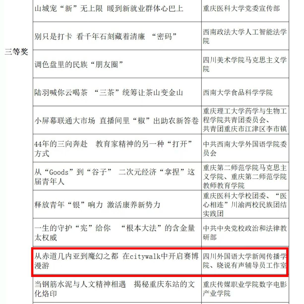 近日,由重庆日报联合重庆市委网信办、重庆市教育委员会、中共重庆市委党史研究室、共青团重庆市委主办的第二届《理响青年》理论短视频大赛获奖名单正式公布。由我校党委宣传部、国际合作与交流处推送的《“洋妹子”惊叹中国发展“加速度”》荣获大赛一等奖,我校新闻传播学院推送的《从赤道几内亚到魔幻之都 在citywalk中开启赛博漫游》荣获大赛三等奖。
