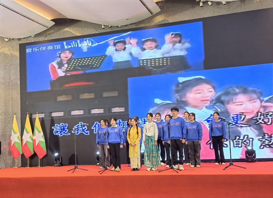 庆典上,我校2025级缅甸语专业学生献唱了中文歌曲《明天会更好》。同学们以饱满的热情和精彩的演绎,赢得了现场来宾的一致好评,充分展现了我校学子昂扬向上的精神风貌。