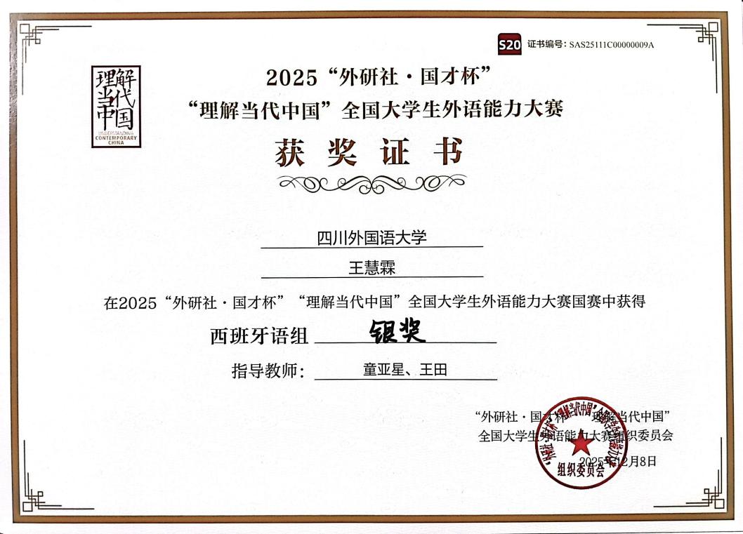 2025年12月6日,由北京外国语大学主办、外语教学与研究出版社承办的“外研社·国才杯”“理解当代中国”全国大学生外语能力大赛(多语种组)全国决赛在北京落幕。西方语言文化学院西班牙语专业2024级研究生王慧霖历经校赛、省赛至国赛的层层选拔,一路闯关,最终摘得西班牙语组国赛银奖;2023级本科生韩雨杉亦获铜奖,双双为校争光。