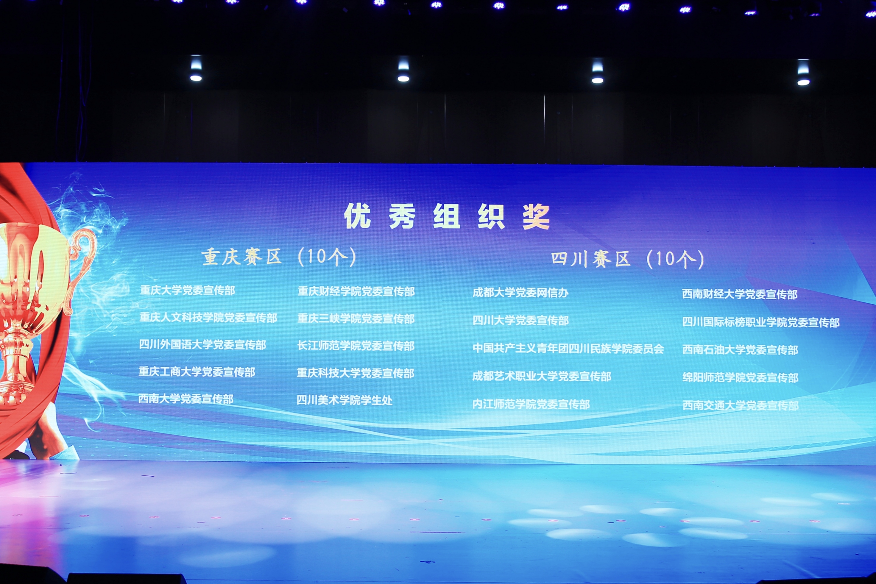12月17日下午,“川渝青年说”第四届川渝大学生网络评论大赛颁奖仪式在成都大学举行。我校党委宣传部连续三届获该项大赛“优秀组织奖”。另外,我校教师蔡竺言获“优秀指导老师”奖,学生冯艺馨的作品《释放龙头企业的超强“磁场”》获三等奖,学生宋昕诺的作品《用一张椅子“包裹”飞驰的人》获优秀奖。