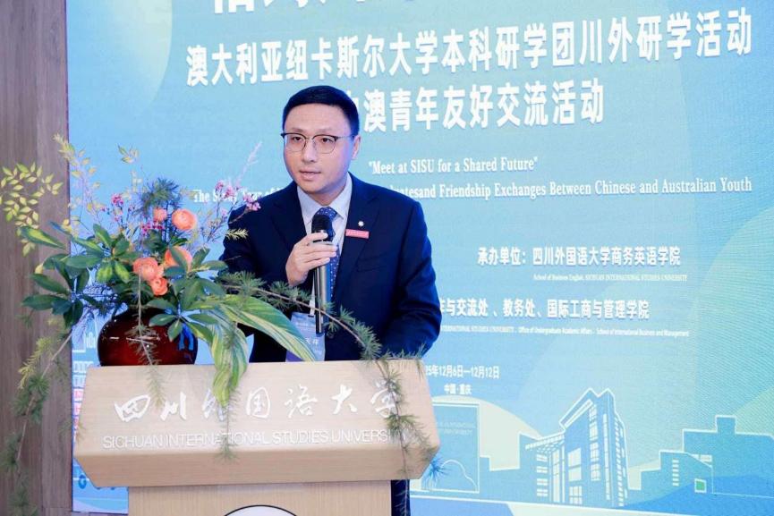 12月7日上午,“相遇川外·共赴未来”澳大利亚纽卡斯尔大学本科研学团川外研学活动暨中澳青年友好交流活动欢迎会在我校歌乐书院举行。澳大利亚纽卡斯尔大学学术理事会主席Marcus Rodrigs、教师Yasmin Librizzi,我校国际合作与交流处处长朱天祥,教务处副处长张庆,商务英语学院副院长顾金成、中澳项目负责人杨前辉、中澳项目办公室主任余静、2025级辅导员金晶以及纽卡斯尔大学近30名本科生和中澳项目近40名本科生共同参与。