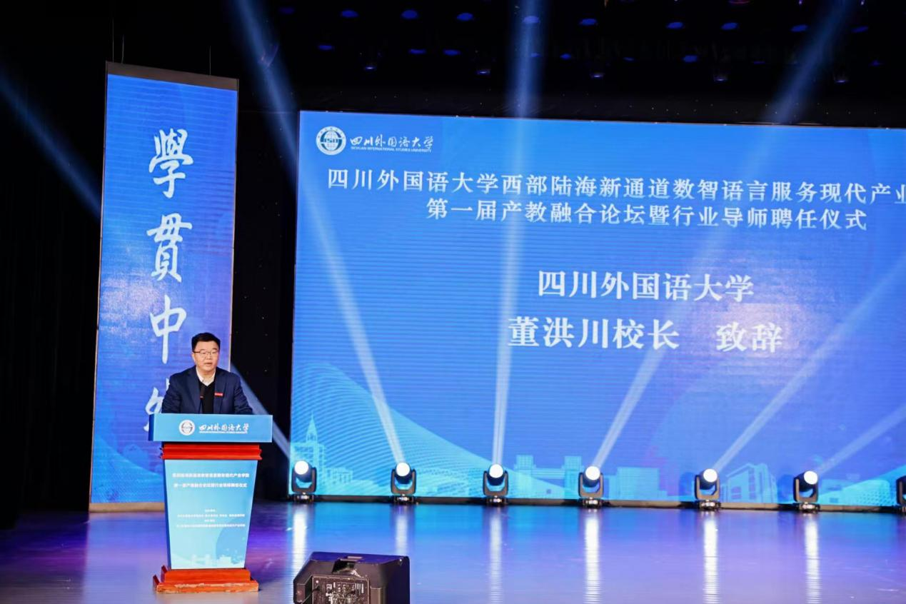 2025年11月26日,学校西部陆海新通道数智语言服务现代产业学院(以下简称现代产业学院)在东区大礼堂成功举办第一届产教融合论坛暨行业导师聘任仪式。校长董洪川,副校长、现代产业学院院长王仁强出席活动。