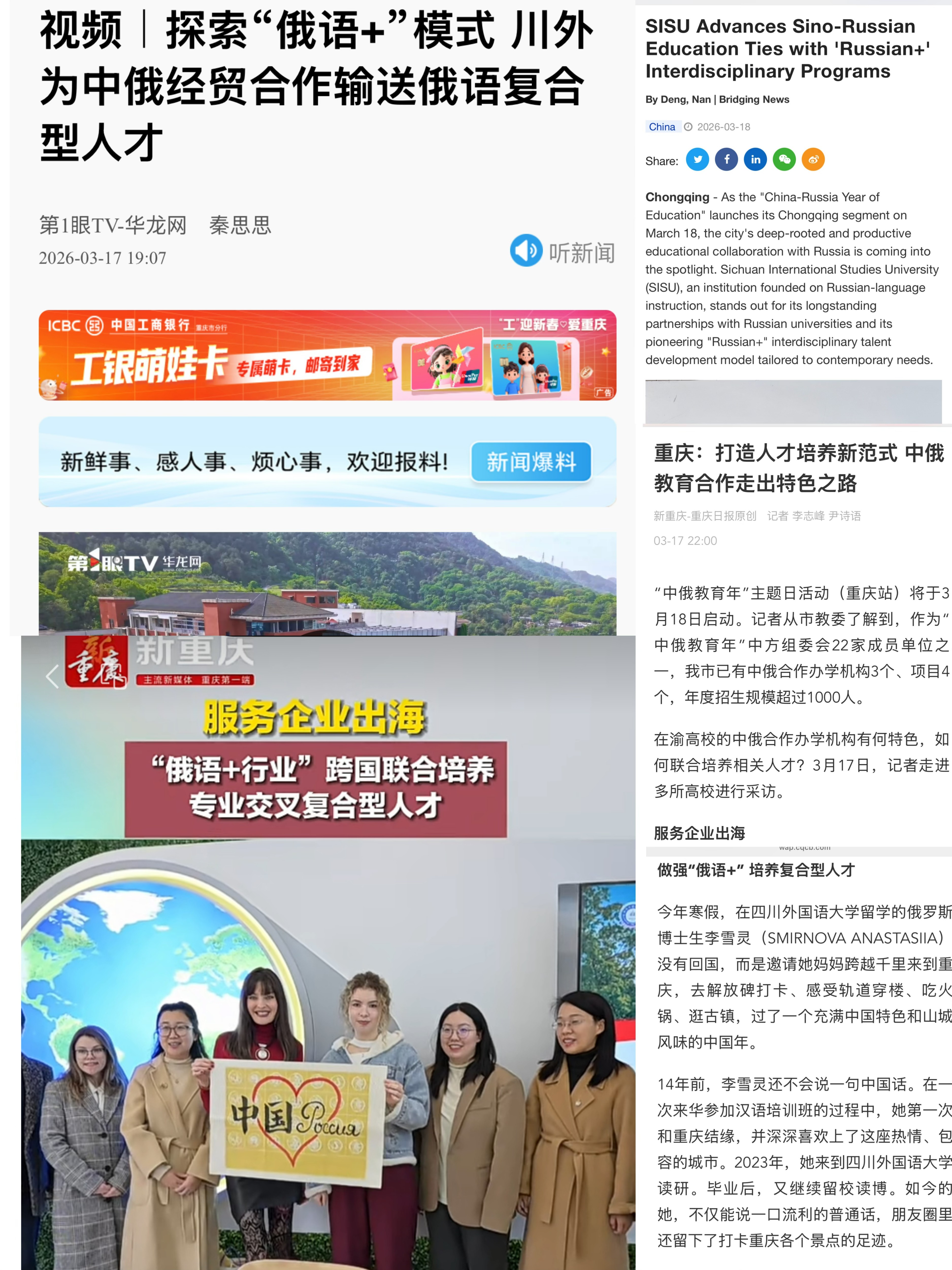 3月18日至19日,“中俄教育年”主题日活动(重庆站)举行。活动期间,四川外国语大学俄语学院70余年对俄教育合作历程及“俄语+”复合型人才培养模式受到《重庆日报》、第1眼TV-华龙网、上游新闻、Bridging News等多家媒体集中关注。