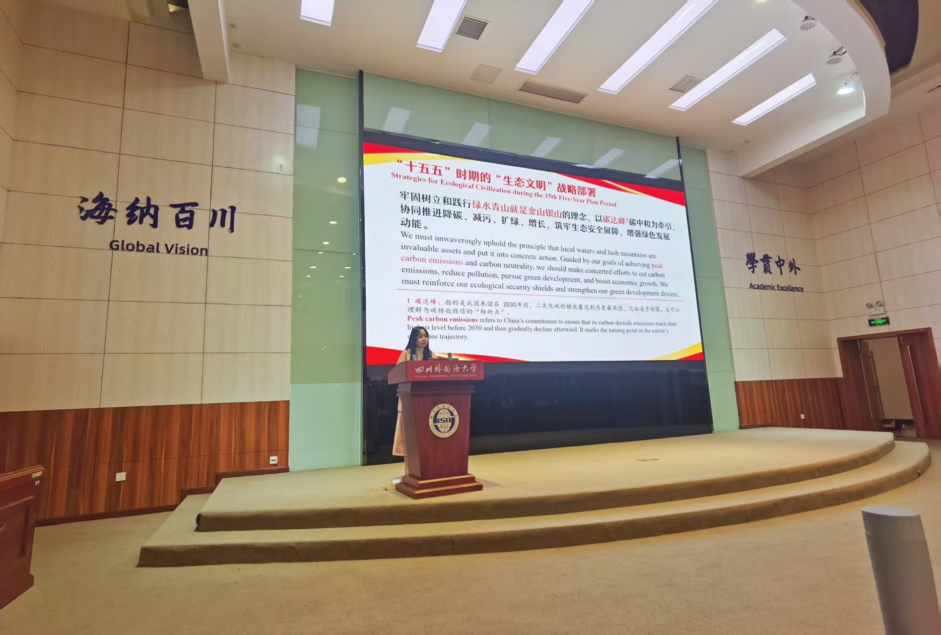 主题宣讲环节中,宣讲团成员依次进行专题宣讲。欧月以中英双语作《生态文明建设:绿色转型与青年担当》主题报告,系统阐述党的二十届四中全会精神要义,全面回顾“十四五”至“十五五”时期生态文明建设目标体系演进历程,深入阐释“碳达峰”“碳中和”战略内涵及实施路径。重点指出青年群体在生态文明建设中的主力军作用,号召广大青年积极践行绿色发展理念,投身美丽中国建设实践。