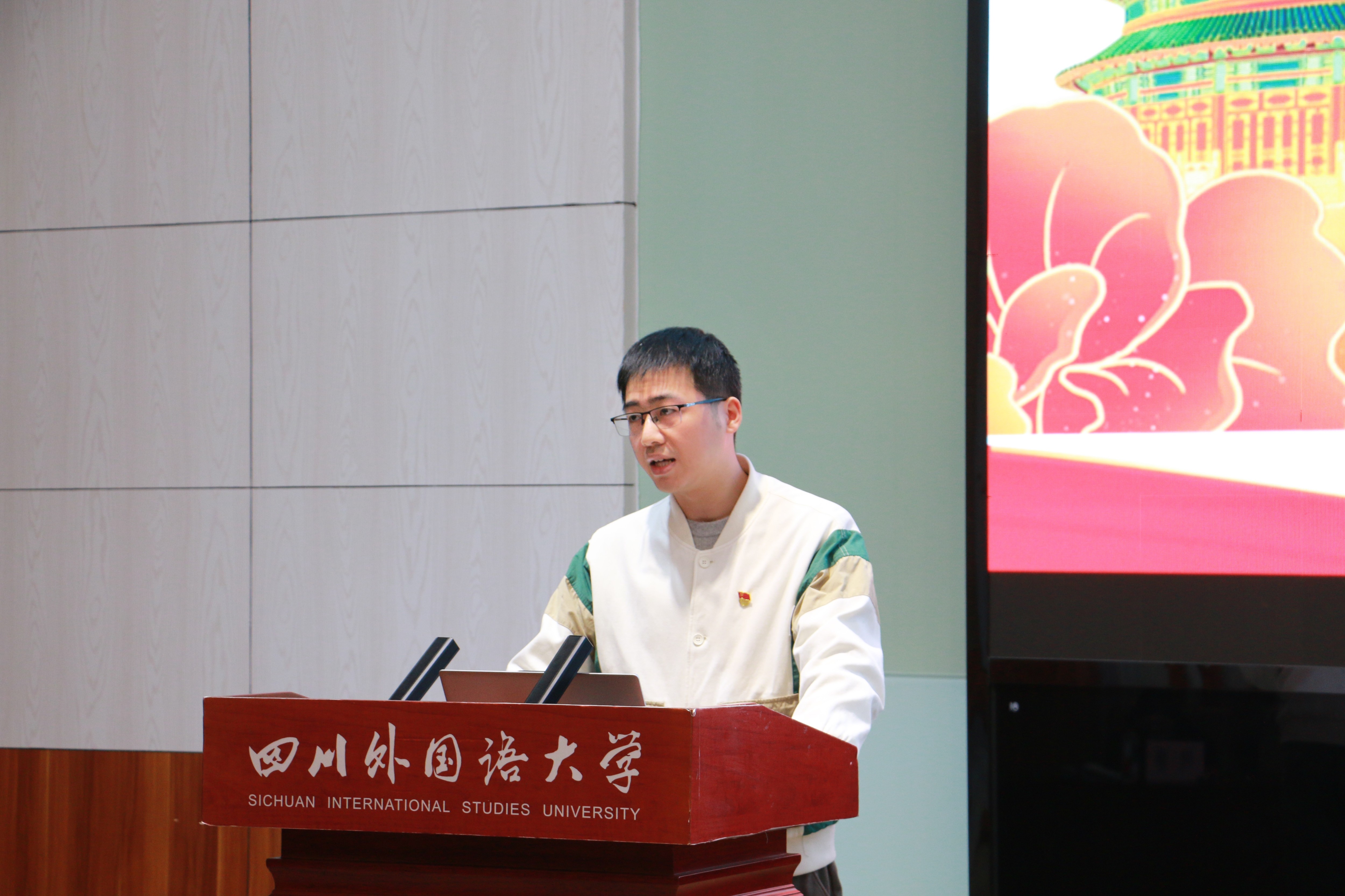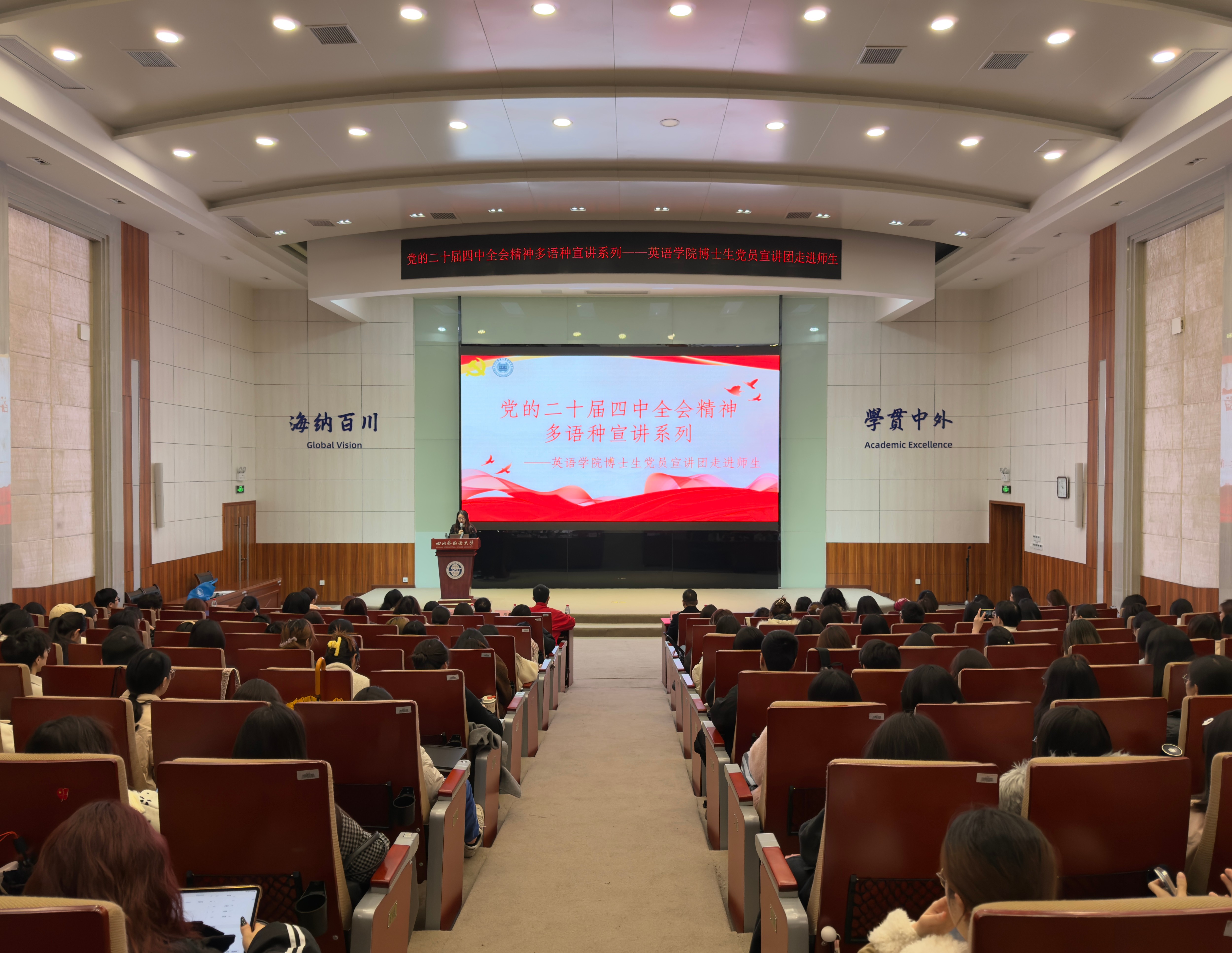 2025年12月3日上午,英语学院博士生党员宣讲团在宏文楼国际报告厅开展党的二十届四中全会精神中英双语专题宣讲会。英语学院党总支书记淡修安,博士生党支部党员、博士生党员宣讲团以及全体师生党员参加宣讲会。英语学院党总支副书记倪静主持宣讲会。